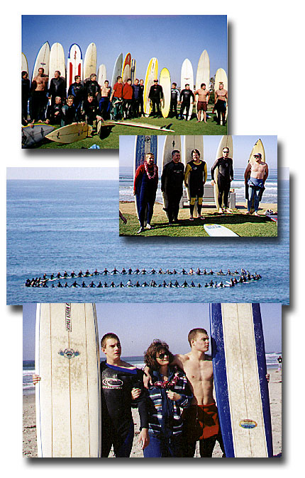 | Seventy-five surfers and more than two-hundred non-surfers (family and friends) gathered on the cliffs above the Law Street Beach to participate in the Paddle Out for Dan Siskowic. It was a beautiful, gorgeous morning: cool, but no wind (there usually is)! Surfers (guys and girls) suited up and when the signal was given, all headed down the cliff, across the beach to pick up a carnation at the water's edge and then out into the Pacific Ocean to pay tribute to Dan. The surfers formed a circle, after getting beyond the breaking waves, and all joined hands. The co-pastor offered prayer and everyone prayed the Lord's Prayer. A friend paid tribute to Dan and requested support of Liz, Cameron and Kyle in future days. Cameron thanked all the surfers for coming and then he and Kyle each scattered some of their father's ashes in the center of the circle. Surfers threw their carnations to the center and splashed water, indicating to those on the cliffs that their task had been completed. They had paid tribute to their father and friend, Dan. HOME | |